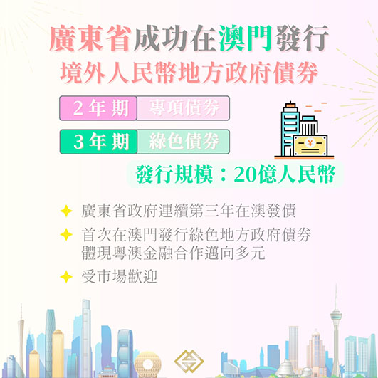 廣東省是次發行的債券面向專業投資者,總發行規模為20億人民幣。其中,2年期的專項債券發行金額為10億人民幣,發行利率定價為2.40%;3年期的綠色債券發行金額為10億人民幣,發行利率定價為2.55%,並取得香港品質保證局(HKQAA)發行前階段綠色金融認證證書。本次地方政府債券的發行受到市場歡迎,認購倍數為2.3倍,取得圓滿成功。