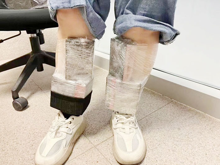 上月二十九日晚上,關員在關閘口岸出境旅客檢查區截獲一名女子,揭發其將六件美妝產品藏於食品包裝內,試圖偷運出境。上月三十日傍晚,關員於關閘口岸截獲女子,揭發其將十三件美妝產品綑綁於腳上,試圖偷運出境。