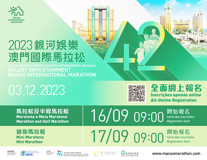 【特訊】由體育局、銀河娛樂集團及澳門田徑總會主辦的「2023銀河娛樂澳門國際馬拉松」將於本年12月3日(周日)舉行。馬拉松及半程馬拉松項目將於9月16日(周六)上午9時開始接受報名,而迷你馬拉松的報名將於9月17日(周日)上午9時開始,各項目報名名額為:馬拉松1,400名,半程馬拉松4,800名,迷你馬拉松5,800名。名額有限,報滿即止。