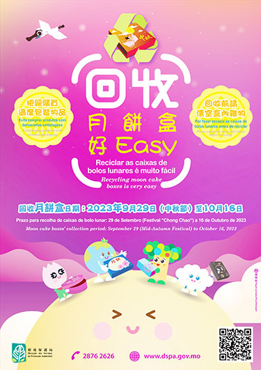 活動目的是宣揚「先重用、後回收」的環保訊息,市民將不再重用的月餅盒帶至回收點前,請先清空盒內雜物,環保局將於活動結束後收集有關月餅盒,其後會循環再造。有關活動詳情可參閱環保局網頁相關專頁(https://www.dspa.gov.mo/richtext_lunarcakeboxrecycling.aspx)或致電「環保熱線」(2876 2626)查詢。