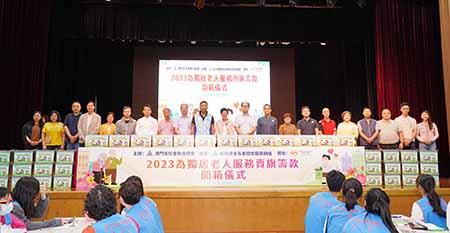 街坊總會當天下午在該會社區服務大樓舉行「二○二三為獨居老人服務賣旗籌款」開箱儀式,社工局長者服務處職務主管鄭榆強、街坊總會會長吳小麗、理事長陳家良、監事長梁慶球、副會長何潤生、黃華強、張麗珍、江超育等嘉賓主持開箱儀式。