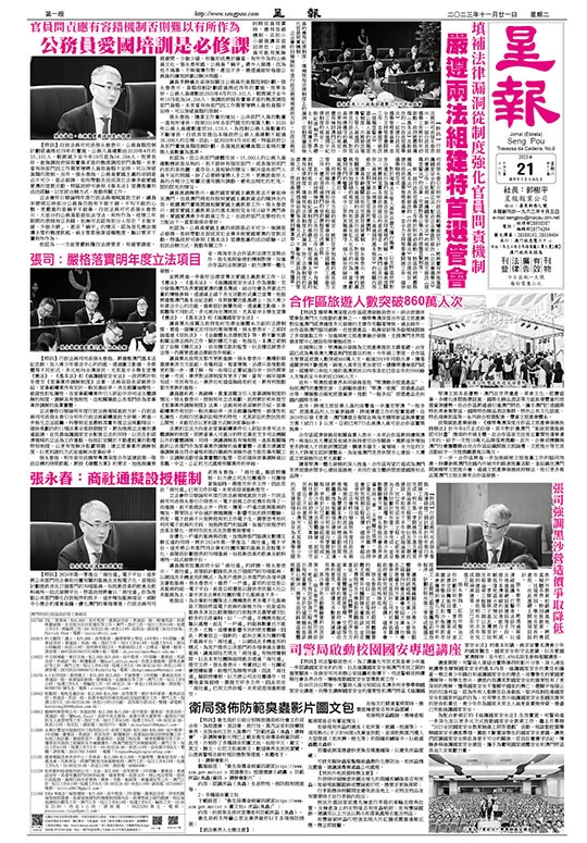 並將將進一步做好法律宣傳及愛國主義教育工作,以《憲法》、《基本法》、《維護國家安全法》作為重點,充分發揚澳門各界愛國愛澳的優良傳統,結合社會各界普法力量的積極參與,透過線上線下多元活動形式廣泛宣傳。他指將重整澳門基本法紀念館,在原展覽功能基礎上,加入青少年普法中心的功能,重新設計展覽佈局,透過圖文影像、多媒體等不同形式,多元地向全澳居民,尤其是中小學生宣傳《憲法》、《基本法》和《維護國家安全法》。