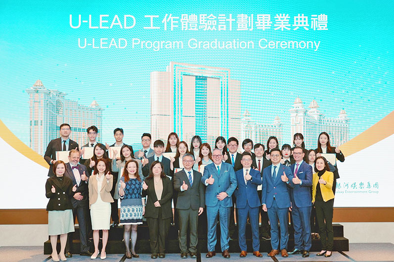 今年,銀娛連續第四年支持特區政府勞工事務局(下稱「勞工局」)之「職出前程實習計劃2023」職場體驗計劃,再度推出「U-LEAD」工作體驗計劃(下稱「『ULEAD』」),為本澳高等院校的畢業生提供為期3個月於大型綜合度假城的實習機會。為嘉許及鼓勵完成計劃的實習生,早前銀娛特意為計劃舉辦畢業典禮,邀請到勞工局代局長陳元童、就業廳廳長李麗琼;銀娛人力資源卓越中心及人力資源及行政高級副總裁祈詠廉與一眾管理層成員出席參與。畢業典禮上,實習生代表感謝勞工局及銀娛推出相關計劃,提供良好環境及實習機會,讓其能夠豐富職場工作經驗,深入了解大型綜合度假城的營運,為未來事業發展打下堅實基礎。