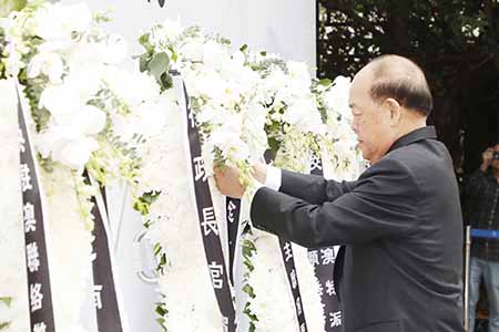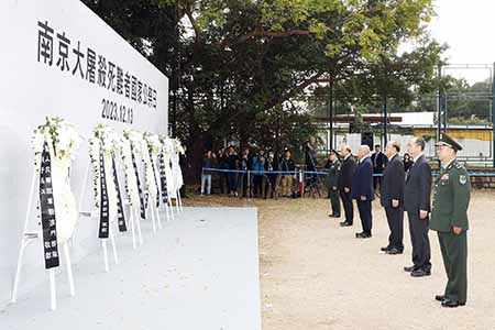 儀式上,保安部隊儀仗隊將寫上「沉痛悼念南京大屠殺死難者」的花圈放到公祭台上,賀一誠等六名公祭代表,分別上前整理花圈緞帶和鞠躬,然後全場默哀一分鐘。