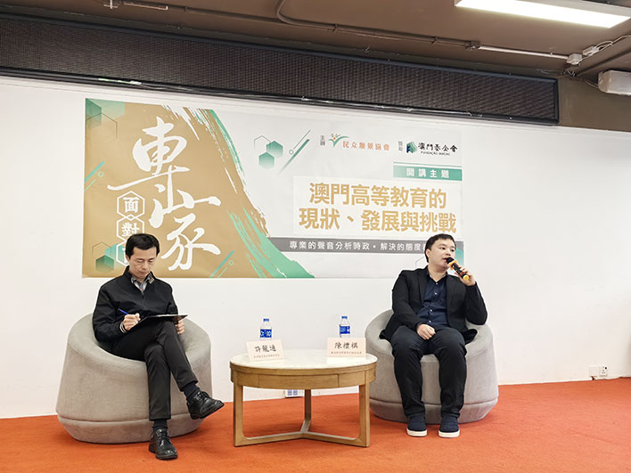 【特訊】日前,民眾願景協會於民眾頤菁中心舉辦「專家面對面·澳門高等教育的現狀、發展與挑戰」講座,是次講座由民眾願景協會常務副會長許龍通主持,邀請珠海藝術職業學院執行校董陳禮祺作主講嘉賓,與現場嘉賓觀眾進行溝通交流。參與講座的有民眾願景協會會長宋碧琪、常務副會長歐陽廣球、李子建等近30人,參與座談人士就本澳高等教育踴躍發言及深入探討。