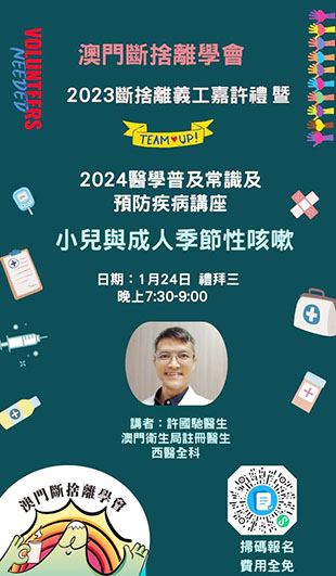 【特訊】澳門斷捨離學會將於2024年1月24日(禮拜三)晚上7時至8時舉行2023義工嘉許典禮暨醫學普及常識及預防疾病講座,主題為「小兒與成人季節性咳嗽」。澳門衞生局註冊醫生許國馳醫生將分享關於季節性咳嗽的知識,包括咳嗽的原因、症狀和常見的治療方法。他還將提供預防季節性咳嗽的實用建議,以幫助參與者保持健康。