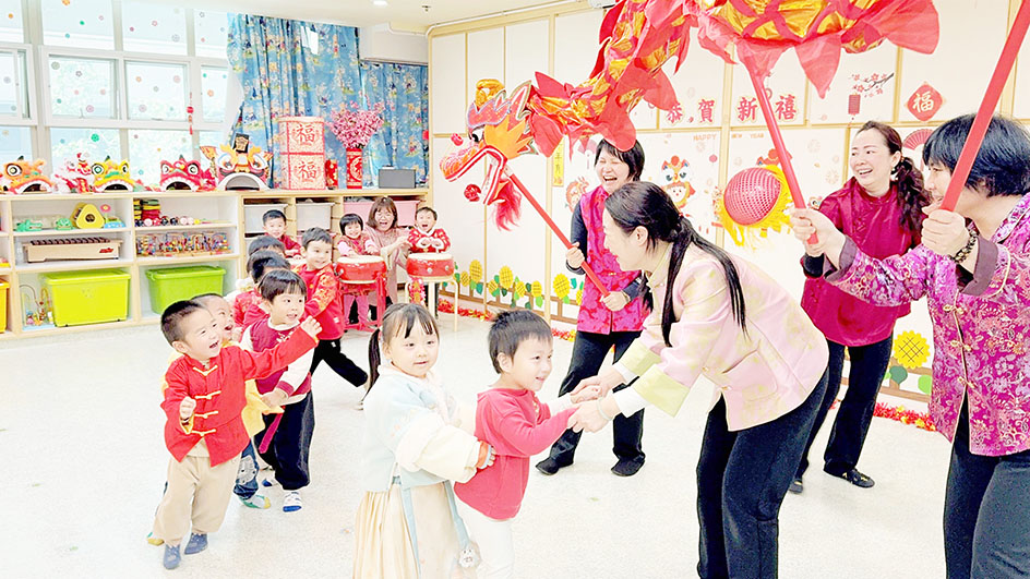 導師透過立體故事書向幼兒講解春節的來源和習俗故事,並介紹各種新春祝賀語句,幼兒們穿上色彩鮮艷奪目的中國傳統服飾,舞龍舞獅和敲打鑼鼓,場面熱鬧更趣致可愛,個個手持各色各樣的賀年飾物拍照保留倩影,互相祝賀聰明伶俐及快高長大,品嚐各式賀年食品,由食品中了解中國傳統文化;在導師的指導和協助下,幼兒色彩鮮麗的桃花樹及賀年揮春由此誕生,選用有機食材讓幼兒一起製作七彩湯圓及餃子,寓意團團圓圓,吉祥如意,樂叫幼兒寓遊玩中學習;