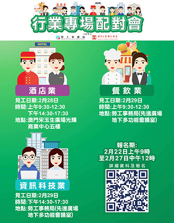 2月29日下午舉辦資訊科技業配對會,提供16個職位空缺,涉及銷售經理、項目主任、二級信息安全分析師、安裝及服務工程師、售前架構師及行政助理等。以上兩場配對會均在澳門勞工事務局地下多功能會議室(澳門馬揸度博士大馬路221-279號先進廣場大廈)舉行。