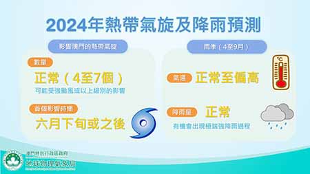 氣象局表示,最新的海洋觀測及預報資料顯示,「厄爾尼諾」的強度有所回落,正逐漸回復至「ENSO中性狀態」,並有機會在夏季發展為「拉尼娜」。地球物理氣象局預測今年(二零二四年)風季將在六月下旬或之後開始,較氣候平均狀況偏晚;全年約有四至七個熱帶氣旋影響澳門,數量屬於正常,且可能受強颱風或以上級別影響。同時,在全球暖化的大趨勢下,預測今年雨季(四至九月)的平均氣溫屬正常至偏高,累積降雨量屬正常,並可能出現極端強降雨過程。