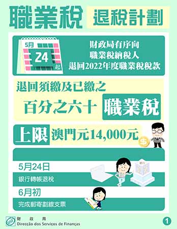 【特訊】根據第22/2023號法律《2024年財政年度預算案》第二十條的規定,財政局自5月24日起有序向2022年12月31日持有澳門居民身份證的約158,400名職業稅納稅人,退還2022年度須繳並已繳納的職業稅稅款百分之六十,上限為澳門元14,000元,涉及退稅總金額約澳門元9.16億元。