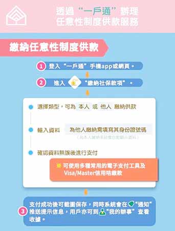 而任意性制度受益人亦可於供款月內以“一戶通”繳納供款,或透過指定銀行的電子渠道及櫃枱、銀通網絡自動櫃員機、自助服務機等電子化渠道繳款。