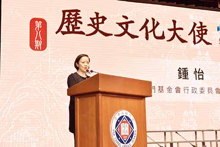 鍾怡代主席致辭時表示,澳門作為粵港澳大灣區內以中華文化為主流、多元文化共存的交流合作基地,在弘揚“澳門歷史城區”世界遺產的突出普遍價值,有賴社會各界的共同協作和努力。特別是作為未來社會棟樑的青年學生們,我們更有責任向他們傳承中華優秀傳統文化和澳門獨特文化價值。該計劃自2018年起與澳門歷史教育學會合辦,至今已舉辦八期,有近千名師生和居民報讀,培育出的種子學生和種子青年,在弘揚澳門傳統的人文關懷,以及培養熱愛家國的歸屬情感方面,都起到積極的帶頭作用。她期望計劃能得到更多支持,繼續舉辦,寄語學員們能成為真正的歷史文化大使,將澳門歷史文化的優良傳統一代一代地傳承下去。