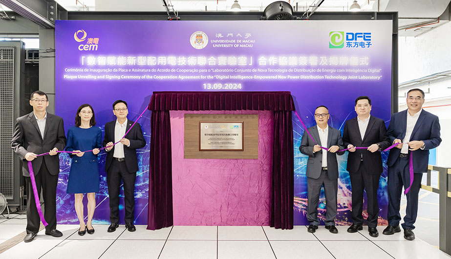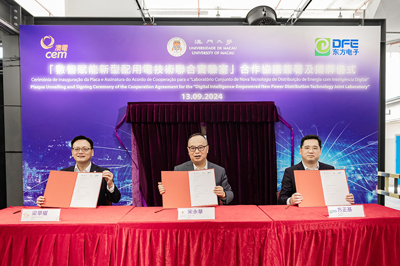 《數智賦能新型配用電技術聯合實驗室》合作協議由澳大校長宋永華、澳電執行委員會主席梁華權及東方電子方正基董事長簽訂,其後由澳大校長宋永華、澳大智慧城市物聯網國家重點實驗室副主任馬少丹、澳電執行委員會主席梁華權、澳電執行委員會執行董事張健、東方電子方正基董事長和煙臺東方威思頓電氣有限公司總經理謝建國共同進行揭牌儀式。