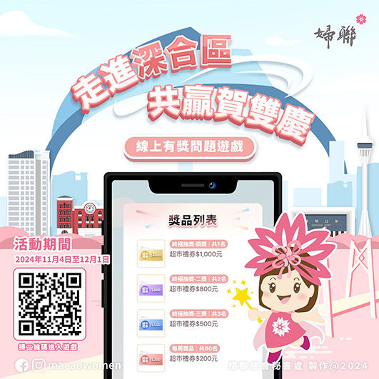 【特訊】為加強橫琴粵澳深度合作區發展的認識,婦聯總會於十一月期間推出“走進深合區,共贏賀雙慶”線上有獎問題遊戲,期望透過輕鬆有趣的線上問答方式,促進市民對深合區建設有更深入的認知,鼓勵更多市民積極參與深合區發展,同時增強對祖國及澳門的認同感。