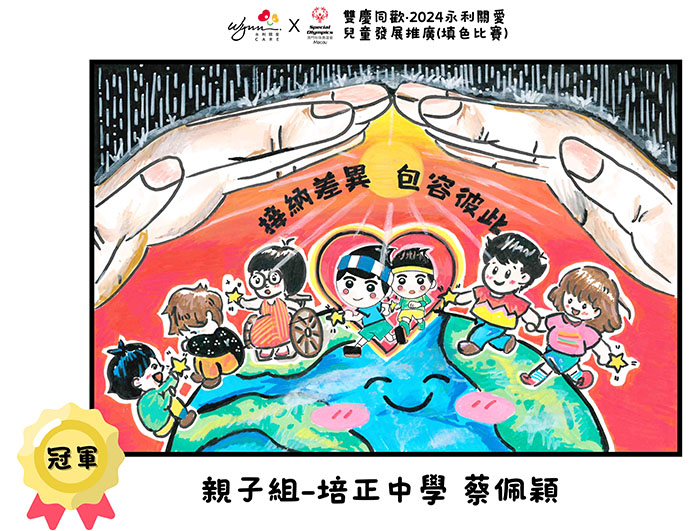 為了推廣共融社會的理念,特殊奧運會及永利關愛舉辦兒童填色比賽,旨在提升公眾對於兒童發展問題及障礙的關注。透過活動,我們希望:(1)提高意識:促進社會對能力差異的理解,讓大家認識到每個孩子都是獨特的。(2)促進包容:鼓勵孩子們學會欣賞彼此的不同,創造一個更具包容性的環境。本次評審嘉賓包括不同界別,除特殊奧運會部門主管外,還有資深美術老師及永利關愛代表等,就主題貼合度、色彩運用、創意繪畫、帶出正向訊息來評分,最後得出以下結果: