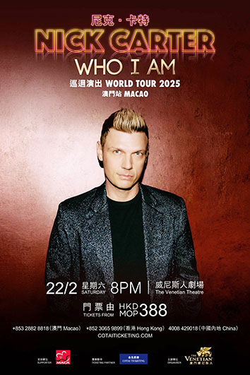 【特訊】國際流行巨星尼克卡特 (Nick Carter) 將於2025年2月22日在威尼斯人劇場舉行尼克卡特2025 <WHO I AM>巡迴演出澳門站。門票將於2024年12月13日中午12時起公開發售,只限網上及電話訂票。