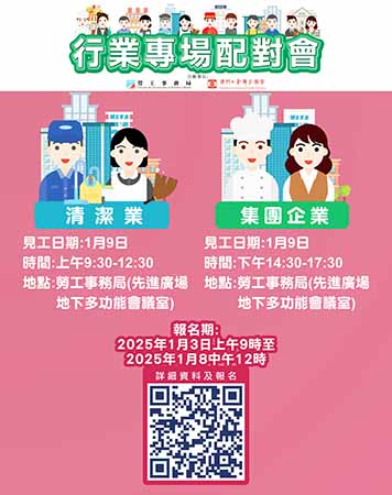 1月9日上午舉辦清潔業配對會,提供73個職位空缺,涉及掃街清潔工人、跟車清潔工人、司機及維修技工。下午舉辦集團企業配對會,提供27個職位空缺,涉及銷售顧問、倉務員、陳列設計員、廚師助理及餐飲服務員。以上配對會均在澳門勞工事務局地下多功能會議室(澳門馬揸度博士大馬路221-279號先進廣場大廈)舉行。