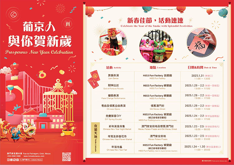 【特訊】「新春迎喜萬象新,金蛇起舞慶團圓」,澳門葡京人精心策劃一系列精彩新春活動及賀年美饌,向市民及遊客獻上充滿喜慶與祝福的春節盛宴,慶祝象徵團圓與幸福的傳統新春佳節。澳門葡京人各處已掛上喜慶吉祥的裝飾,洋溢著濃厚的節日氣氛,在LINE FRIENDS PRESENTS CASA DE AMIGO大堂及BROWN & FRIENDS CAFE & BISTRO,高約三米的人氣LINE FRIENDS MEGA BROWN身穿華麗賀年唐裝,與訪客歡聚一堂,迎接新春美好祝願,訪客與 MEGA BROWN拍照打卡可換領 LINE FRIENDS新春祝福御守盲盒;此外,澳門葡京人H853 Fun Factory娛樂廠將呈獻精彩紛呈的賀年慶祝活動,包括免費揮春、舞獅表演、財神出巡、變臉表演、粵曲及懷舊金曲表演等,展現澳門獨特的中西文化交融特色。另外,集飲食、休閒、娛樂的新地標「夜葡天地」在農曆新年期間舉辦美食市集、年宵及新春花市,為市民及遊客帶來包羅萬有的節慶享受。品味新春佳餚,感受節日祝福與歡樂 - 盡在澳門葡京人。