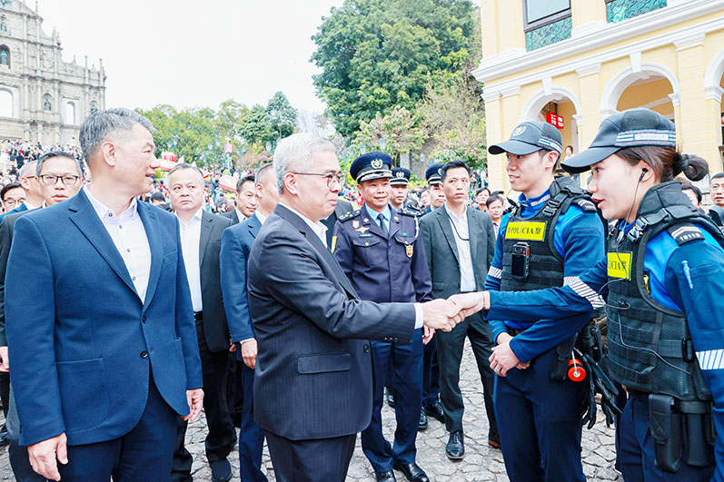 【特訊】農曆新年期間,澳門各區盛事連連,氣氛熱鬧,為讓市民及旅客在澳平安度歲,保安司轄下各部隊及部門人員於節假日仍緊守崗位,堅決維護新春期間治安穩定,確保社會安全和公共秩序,為廣大市民及旅客提供服務。1月31日(年初三),保安司司長黃少澤、警察總局局長梁文昌、澳門海關關長何浩瀚以及一眾保安範疇領導及主管人員,親身往前線工作單位視察,同時向執勤中的同事表達慰問。