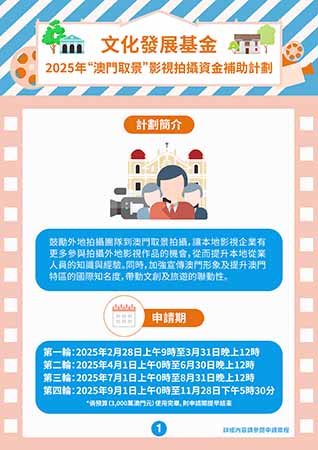 資助為補貼形式,批給資助上限為申請項目在澳門進行拍攝取景工作預算支出的30%至40%,並按影視作品類型上限為50萬或200萬澳門元。評審時將考慮申請項目對澳門城市形象的宣傳作用、影視作品的製作規模及播放渠道的認受性、本澳影視業界的參與程度等。如外地拍攝團隊為外國,尤其一帶一路及葡語系國家和地區依法設立的實體,申請項目可獲得額外加分。為詳細介紹上述資助計劃的申請事宜及解答申請人問題,基金將於3月6日下午3時假誠豐商業中心7樓演講廳(地址:澳門宋玉生廣場322-362號)舉行講解會,有興趣人士請於基金網站(www.fdc.gov.mo)報名,查詢請致電8985 0834或電郵dgaf@fdc.gov.mo。