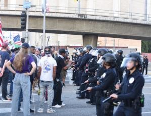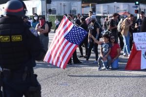 當天下午,中新社記者來到洛杉磯市中心聯邦拘留中心大樓前,這裡是連日來洛杉磯反搜捕非法移民行動抗議示威爆發衝突最激烈的地點之一,大量警車和警員部署在週邊區域嚴防死守。隨著時間推移,抗議者越聚越多。有抗議者迫近警方防線,雙方發生肢體衝突。尤其是多輛國民警衛隊軍車駛向聯邦拘留中心大樓時,一些情緒激動的抗議者衝過去拍打車身、高聲叫罵,警方隨即上前以警棍推開人群。