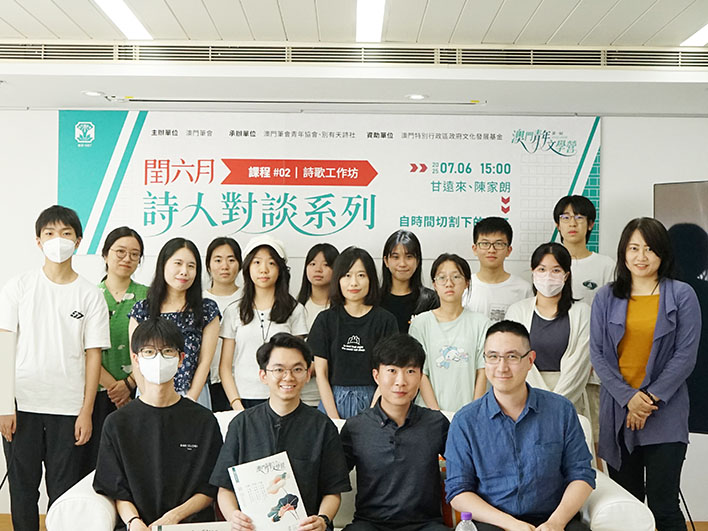 “閏六月詩人對談”為第一屆澳門青年文學營活動,邀請不同世代和風格的六位澳門詩人,圍繞作品討論諸種現代詩議題,指導詩歌欣賞和創作。第一場對談已於七月六日舉行,由澳門青年詩人甘遠來、陳家朗以“自時間切割下的天工”為題,探討現代詩創作技巧。筆會兼青協理事、青年作家李懿、澳門科技大學助理教授張譽馨、余少君博士、鄭昀博士、首屆文學營學員及多名自發報名的文學愛好者參與。