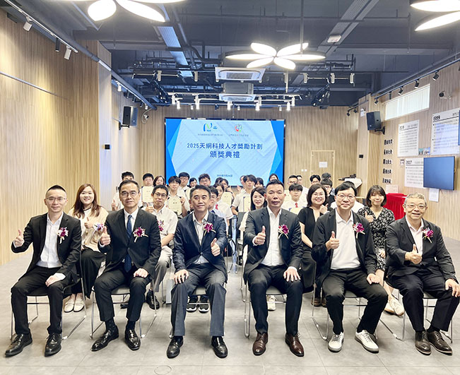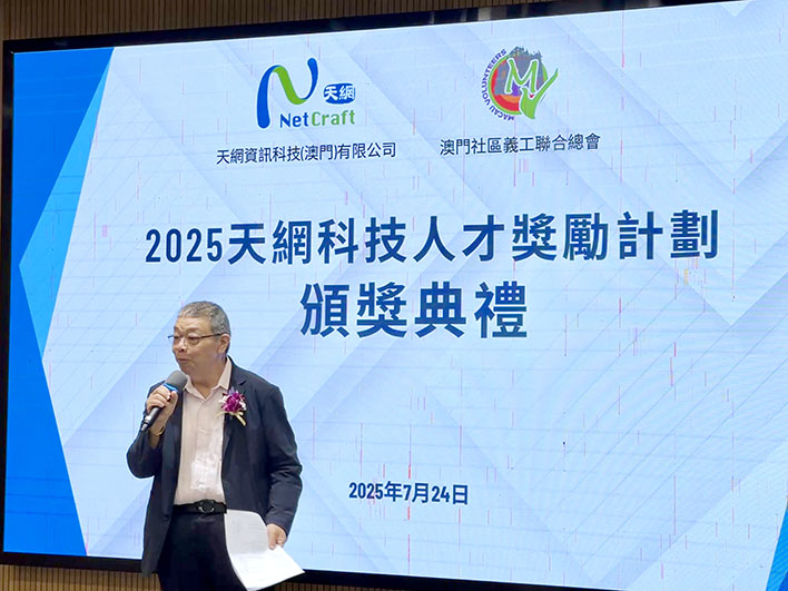 【特訊】由天網資訊科技(澳門)有限公司與澳門社區義工聯合總會聯合舉辦的「2025天網科技人才獎勵計劃」頒獎典禮,昨日下午三時半假街坊總會社區服務大樓迎聚廊舉行。中聯辦社工部處長羅振宇、街坊總會理事長陳家良、副會長何潤生、副理事長梁鴻細、天網資訊科技(澳門)有限公司副主席歐家輝、社區義工總會理事長鄧文基等嘉賓出席。