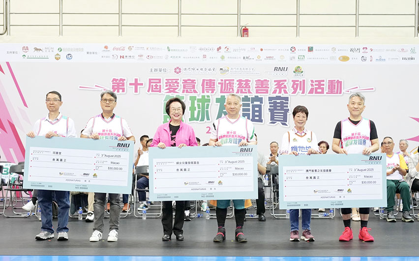 由婦女聯合總會、供應商聯合會、大西洋銀行及大昌食品市場聯合主辦之「第十屆愛意傳遞慈善系列活動之籃球友誼賽」,昨日在塔石體育館舉行,婦女聯合總會永遠會長賀定一、中聯辦社工部一級主任科員蔡陸宏、供應商聯合會理事長李傑興、大西洋銀行執行董事杜琪新、大昌食品市場董事長李傑志、同善堂副主席馬有友、美高梅人力資源副總裁趙翠華、婦女體育總會會長林婉妹、智耆之友協進會會長劉玫瑰等嘉賓主禮開球儀式。