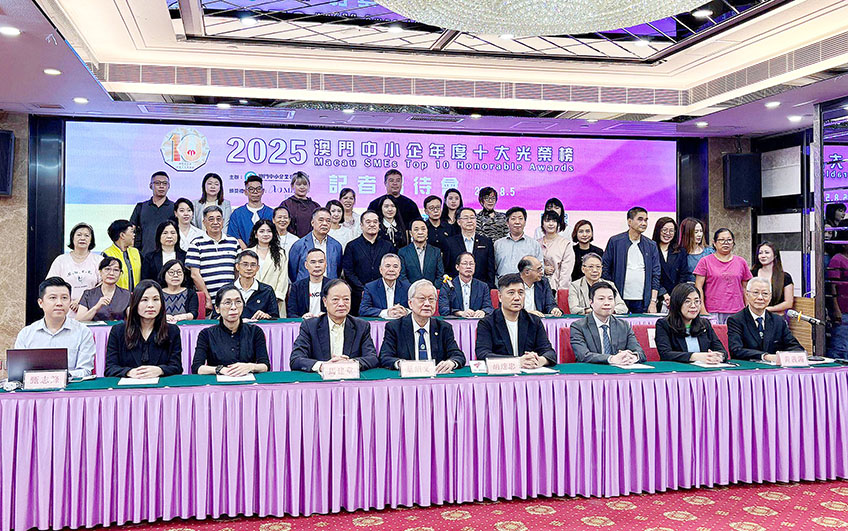 由澳門中小企業發展聯盟主辦之 「2025年度澳門中小企十大光榮榜」新聞發佈會,昨午假帝濠酒店舉行。聯盟會長葉紹文、理事長胡達忠、監事長馬建章、籌委會主席黃義滿、副理事長甄志鋒出席並介紹活動詳情。