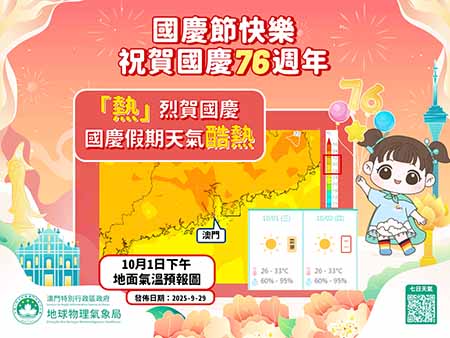 氣象局表示,本週將迎來國慶假期,全民歡慶之餘,亦要關心一下天氣變化,因踏入十月上旬,熱帶氣旋活動仍然活躍,預料本週將持續受高空反氣旋影響,國慶假期前後天氣持續酷熱,日間陽光充沛,加上風力較微弱,最高氣溫可達攝氏三十三度或以上。因此,巿民歡度國慶之餘,身處戶外或進行戶外活動時務必做好防暑措施,適時補充水份。雖然已進入秋季,但由於目前副熱帶高壓仍位處較高緯度地區,提供了熱帶氣旋生成的空間,因此熱帶氣旋活動仍然活躍。