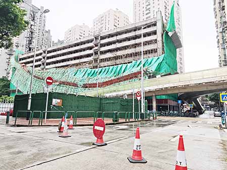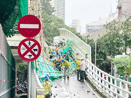 【特訊】正在拆卸重建的台山嘉翠麗大廈外牆,在颱風吹襲下,有大片棚架倒塌,壓在對開一段行車天橋上,大廈對開的行車及行人路段,需要臨時封閉。八號風球除下後,當局安排多名工作人員加緊清理,至昨日傍晚完成清理。