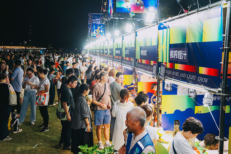 活動現場設置了四十餘個美食及文創攤位,粵澳特色小吃、冰爽飲品逐一登場。活動還特邀正安吉他、珠遵新茶飲參與,使市民與遊客於光影交融的氛圍裡充分領略舌尖上的愉悅,體悟灣區青年的創意活力及感受山海相連的獨特韻味。活動還特別設置了現場互動環節,參與者可領取活動限定周邊產品,發布活動相關內容至社交平台還可領取專屬好禮,進一步增強了觀眾的參與感和體驗感。