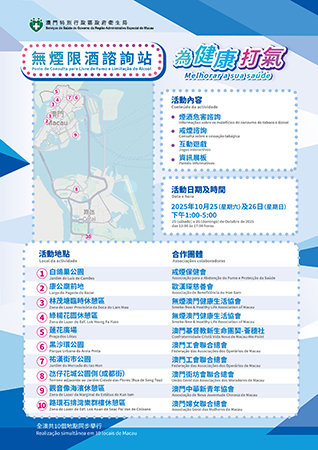 【特訊】為落實《健康澳門藍圖》所訂定的總體目標與指標,積極推動“健康社區”計劃,並將資源進一步下沉至社區,衛生局聯同本澳8個社團,於10月25及26日(本週六、日)下午1:00至5:00,舉辦“無煙限酒諮詢站”活動。