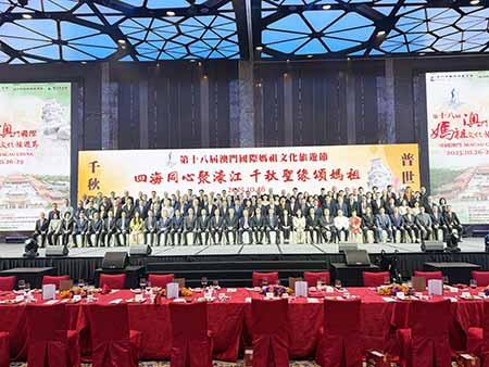 【特訊】由澳門中華媽祖基金會主辦,湄洲媽祖祖廟董事會協辦,澳門基金會贊助之「第十八屆澳門國際媽祖文化旅遊節開幕式暨乙巳年媽祖祭典」於今早假媽祖文化村舉行,活動組委會昨晚舉行歡迎宴會,與來自內地、台灣及「一帶一路」沿線國家的宮廟代表等海內外嘉賓逾千人歡聚一堂,以媽祖之恩澤,連結兩岸同胞的情感,促進心靈的契合,共同構建中華民族偉大的精神家園。