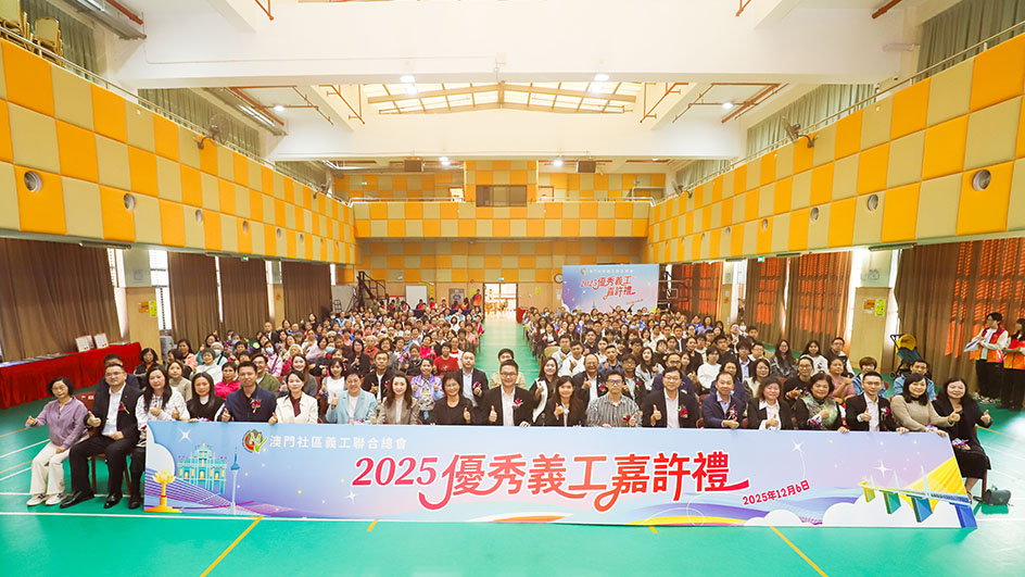 【特訊】由澳門社區義工聯合總會主辦的「2025優秀義工嘉許禮」於今天下午三時正假街坊總會社區服務大樓舉行,出席嘉賓有中聯辦社會發展部副處長鄭奕成,教青局青年廳廳長張敏輝,衛生局社區醫療衛生廳廳長王燕,法務局法律推廣及公共關係廳代廳長黃嘉慧,社工局社區協作處技術員李鎮輝,街坊總會會長吳小麗、副理事長兼立法議員梁鴻細,廣東省志願者聯合會監事長李森,珠海市志願者聯合會副會長鄭憶蘭,佛山市順德區容桂街道志願者聯合會秘書長董鳳儀、社區義工總會理事長鄧文基,以及各義工團體代表等。