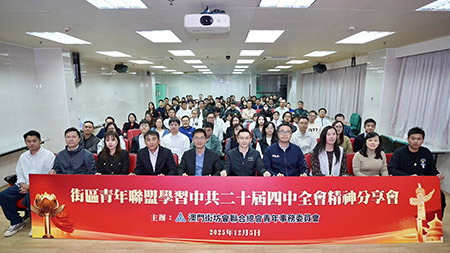【特訊】12月5日晚上七時,街坊總會青年事務委員會聯同街區青年聯盟舉辦的「街區青年聯盟學習中共二十屆四中全會精神分享會」在街坊總會社區服務大樓二樓舉行。活動邀請中聯辦社會發展部副部長姜正宇為一眾青年分享中共二十屆四中全會精神。中聯辦社會發展部處長羅振宇、副處長鄭奕成、街坊總會副理事長兼青委主任鄧文基、街區青年協會理事長陳偉良等近百名青年出席。