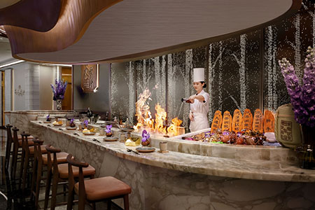 踏入餐廳,賓客將感受到溫度和香氣的鮮明對比:一邊是火熱的鐵板燒和即席烹調鮮嫩肉類與海鮮,另一邊是即開空運生蠔的生蠔吧,呈現精彩絕倫的料理表演。賓客可自由選擇享用來自荷蘭、法國及愛爾蘭等地的即開鮮美生蠔,或以青辣椒醬或蒜蓉醬精心烹調的熟食版本。此外,日式壽司及刺身美饌,當中包括油甘魚、帶子及八爪魚等,亦為味蕾帶來更精彩、更豐富的選擇。