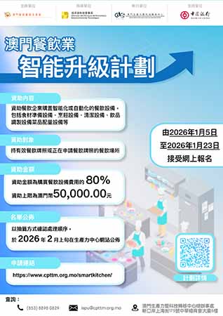 【特訊】由澳門餐飲業聯合商會主辦、澳門生產力暨科技轉移中心(下稱“生產力中心”)執行的“澳門餐飲業智能升級計劃”(下稱“計劃”),由1月5日起接受申請,該計劃旨在支持本澳中小型餐飲企業利用智能或自動化設備進行轉型升級,歡迎符合資格的企業申請。
