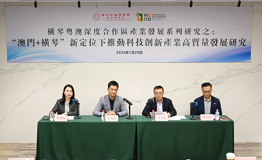 【特訊】1月29日,澳門中華廣東辦舉辦《橫琴粵澳深度合作區產業發展系列研究之“澳門+橫琴”新定位下推動科技創新產業高品質發展研究》報告發佈會。廣東省委橫琴工委委員、省政府橫琴辦副主任葉真;澳門中總理事長兼廣東辦首席代表馬志毅,副理事長兼粵港澳大灣區工作委員會主任蕭志偉、副主任何敬麟,常務理事兼廣東辦事處代表黃仁民、畢志健,廣東辦事處主任陳秀釵;橫琴創新發展研究院副秘書長、自貿創新研究所所長許文傑等出席發佈會。