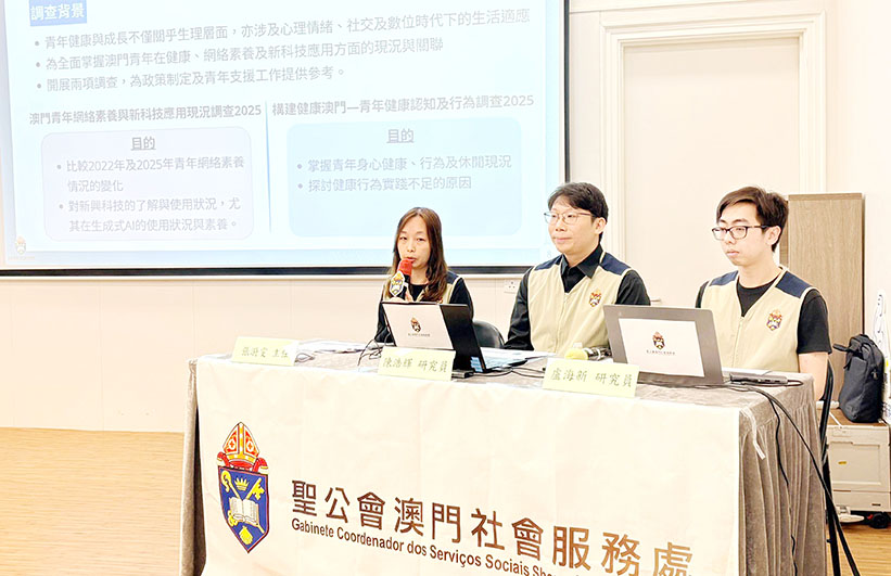 聖公會澳門社會服務處昨日舉行發佈會,公佈「澳門青年網絡素養與新科技應用現況調查2025」及「構建健康澳門—青年健康認知及行為調查2025」結果,分別聚焦了解青年的網絡與AI素養、心理健康及健康生活習慣的認知和行為的現況。兩項調查於去年六月至九月開展,分別收集到九百五十二份及九百三十二份十三歲至三十五歲青年的有效問卷。