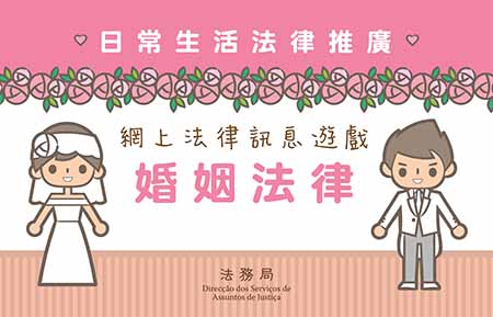 法務局於二○一六年構建的「日常生活法律指南網專題網站」,以嶄新的一站式平台,讓市民輕易了解與其生活中息息相關的法律訊息。為配合該網站的推出,以及加強有關日常生活法律的推廣,法務局將按序推出不同主題的系列推廣活動,其中包括舉辦網上法律訊息遊戲。今年第一期推出的主題是:婚姻法律。通過簡單的問答,市民可以了解結婚登記、婚姻財產制及婚姻協定等規定。