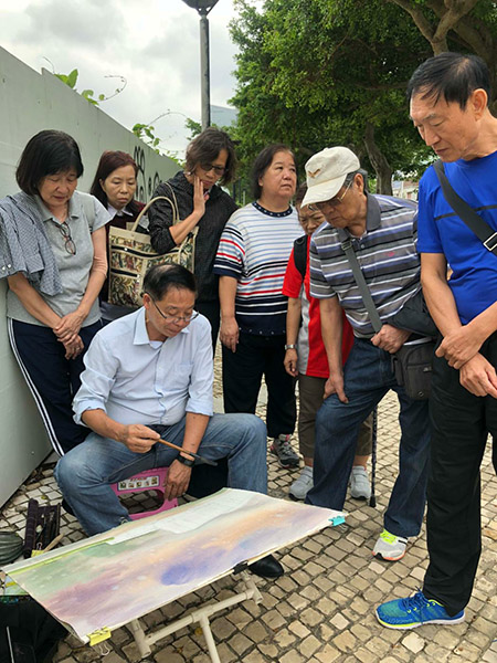 一班澳門理工學院長者書院學員在10月期間參加由藝博館舉辦的「藝海傳耆」活動,以現時在該館三樓展出的「變遷中的風景——藝博館藏澳門水彩畫展」為核心,開展多項藝術課堂,讓長者從多角度瞭解博物館教育工作。「展品欣賞」課由該館館長陳繼春、策展人梁惠萍、畫家黎鷹在展覽現場介紹澳門十九世紀至今的水彩風景畫,由作者生平到作品構圖,甚至色彩運用,乃至在澳門水彩發展歷程中的角色等均有涉及。另外尚有由資深導賞員高婉芳主持的「導賞技巧觀摩」,以及由畫家黎鷹親自示範水彩寫生技巧,指導學員如何運用水彩細膩的色彩捕捉澳門的良辰美景。有學員表示,本身在長者書院已有繪畫西畫的學習經驗,認同該展覽有澳門特色,內容富有親切感,對是次活動感到非常充實和滿足。