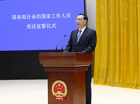 宣誓後,李克強要求大家忠於憲法,依法履職,實幹擔當,清廉自守,勤勉盡責做好本職工作,盡心竭力為群眾辦好事、解難事。全面貫徹習近平新時代中國特色社會主義思想和中共十九大精神,增強“四個意識”,不懈奮鬥,保持經濟社會平穩健康發展,交出經得起人民和歷史檢驗的答卷。