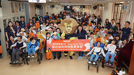 適逢復活節,美高梅於日前組織30多位義工隊成員到訪協同特殊教育學校,與逾60位年齡介乎6至12歲的學生一同慶祝節日。義工隊成員準備了歌唱和魔術表演,以及適合學童的趣味遊戲,透過彼此間的互動傳遞愛與關懷。美高梅的餅房廚師更特別為每位學生製作復活節甜品和三明治,為他們帶來驚喜和節日氣氛,現場洋溢開懷的歡笑聲。