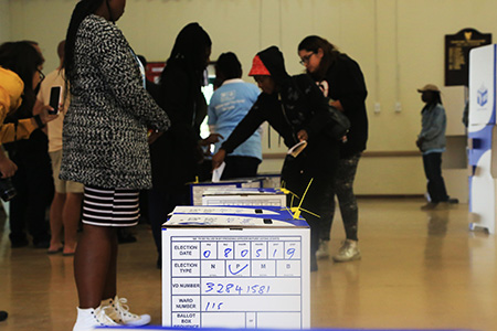 當日一早,記者來到位於約堡商業中心桑頓地區的一投票點,儘管時間還不到9點,但已經有大批選民趕到這裡排隊投票。南非實力最強的三大政黨非洲人國民大會(非國大)、民主聯盟和經濟自由戰士黨的工作人員則在投票點入口處發放著競選傳單,力圖在最後時刻爭取更多選票。