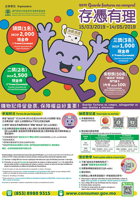 為期兩個月的「存憑有理 – 2019」活動即將結束,參加情況踴躍,登記辦法簡易,消費者只需持有3月15日至5月14日期間於「誠信店」單筆消費滿50元或以上金額的單據、收據等消費憑證就可登記參加抽獎,參加者可選擇在「誠信店」手機應用程式內登記,亦可將填妥資料的消費憑證副本投入消委會位於高士德大馬路26號何鴻燊夫人大廈地下或黑沙環新街52號政府綜合服務大樓一樓M區辦事處的收集箱內。「存憑有理 – 2019」活動獎品包括頭獎2,000元(一名)、二獎1,500元(兩名)、三獎1,000元(三名)的現金券,五十名安慰獎各得內附100元的「誠信店」特別版電子貨幣儲值咭乙張。