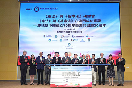 【特訊】澳門高等教育發展促進會在澳門科技大學舉行“《憲法》與《基本法》研討會,本次研討會主題為“《憲法》與《基本法》在澳門成功實踐——慶祝新中國成立70週年暨澳門回歸20週年”,全國人大常委會法制工作委員會、澳門基本法委員會副主任張勇、澳門社文司司長譚俊榮、澳門中聯辦副主任薛曉峰、國務院港澳事務辦公室副司長奚俊堅、北京大學法學院陳端洪教授、香港大學法律學院陳弘毅教授、澳門大學法學院駱偉建教授、高等教育局局長蘇朝暉、法務局代局長鍾穎儀、澳門基本法推廣協會副理事長兼秘書長何少金、該會會長莫啟明及理事長龐川等主禮。