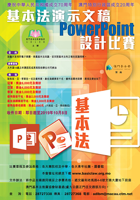 【特訊】為慶祝中華人民共和國成立70周年、澳門特別行政區成立20周年,並鼓勵大家利用電子媒體,推廣基本法知識,從而對基本法有正確的認識理解,本會舉辦“基本法演示文稿PowerPoint設計比賽”,以加深廣大市民對基本法的認識,歡迎市民踴躍參加。