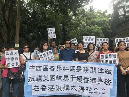 參與抗議的團體來自香港新界、九龍及港島各區,抗議人士既有年輕人也有長者。他們從當天下午2時許開始,陸續趕到位於中環花園道的美國駐港澳總領事館抗議,一波人離開又接連有另一波人抵達。抗議現場口號聲不絕,包括“反暴力”“撐修例”以及“移交逃犯 天經地義”等。