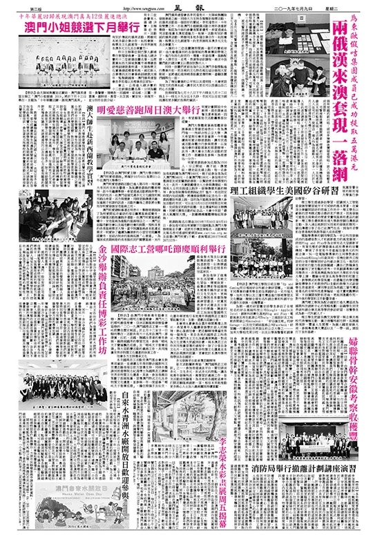 【特訊】由澳門中華新青年協會主辦,澳門杮山哪咤古廟值理會、澳門大三巴哪咤廟值理會、亞洲志願服務發展協會協辦的「二○一九澳門國際志工營——哪吒節慶在歷史城區」於上月十二至廿一日順利舉行。活動共有六十名來自澳門、菲律賓、印尼、法國、韓國及香港的青年參與,藉跨越國界的學習交流、參與「哪吒太子寶誕飄色巡遊」及「哪吒太子聖尊巡遊」等大型節慶活動的義務工作,共同推廣世界非物質文化遺產的保育工作。